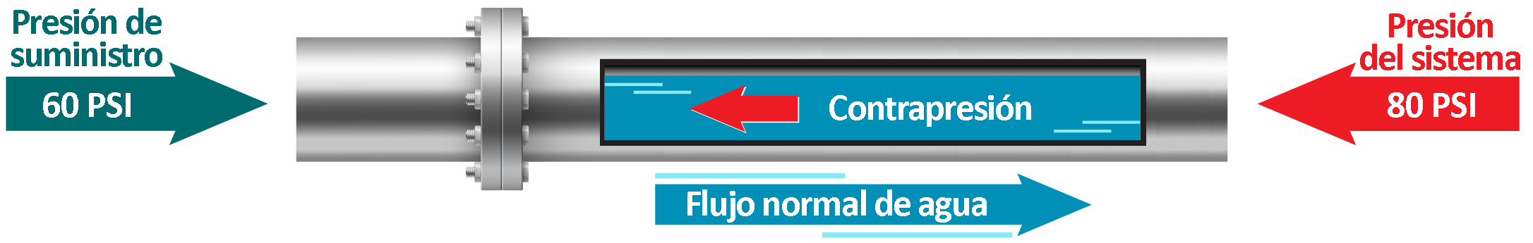 La contrapresión se produce cuando la presión en un sistema de agua privado excede la del sistema público provocando que el agua fluya hacia atrás y potencialmente introduzca contaminantes en el sistema público.