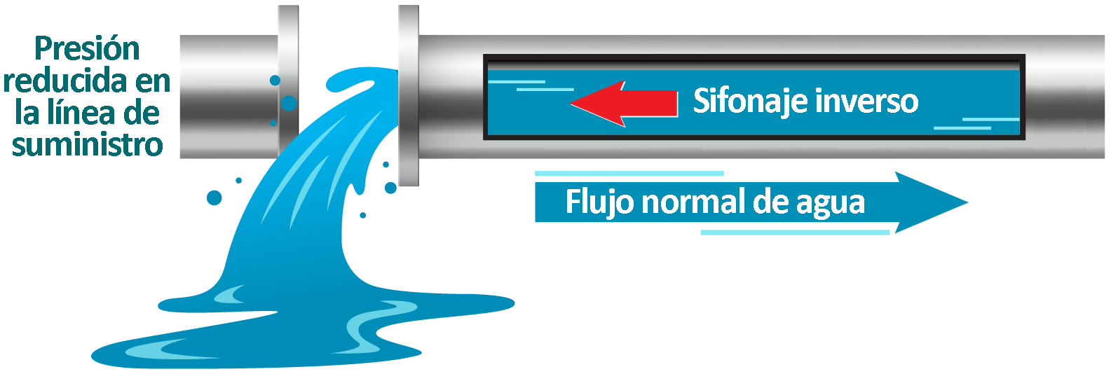El sifonaje inverso ocurre cuando la presión en el sistema público de agua baja, como durante una rotura en la tubería principal o durante una demanda muy alta de agua (por ejemplo, el uso de hidrantes). Esto puede generar un vacío, lo que provoca que el agua fluya en sentido inverso y arrastre contaminantes al sistema.